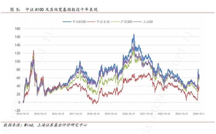 自基日2005年12月31日以来,截至2024年10月31日,中证A100指数累计收益率270.93%,区间年化收益率7.43%。