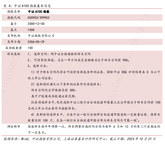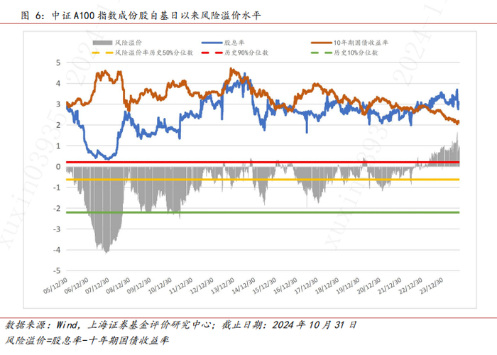 3.估值水平截至2024年10月31日,中证A100指数的股息率为3.09%,为自基日以来的82.68%百分位。由股息率与十年国债收益率相减得出的指数的风险溢价水平处于历史98.6%分位,在股东回报和股债性价比层面体现出较高性价比。