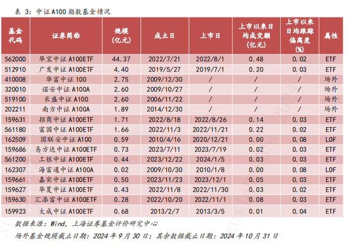 华宝中证A100ETF(562000)自2022-8-1上市以来紧密跟踪中证A100指数。根据Wind数据,截至2024年10月31日,该ETF流通规模为44.37亿元,上市以来ETF日均成交额为4838万元,区间跟踪业绩基准偏离度均值为0.02%,在全市场跟踪中证A100指数的16只被动指数基金(不含ETF联接基金)中,华宝中证A100ETF规模最大,流动性最好,跟踪偏离度较低,能较好满足大规模资金对中证A100指数的配置和交易需求。