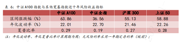 近10年,中证A100指数累计涨幅63.86%,年化波动率22.01%,同期中证全指、沪深300、上证50指数涨幅分别为36.56%、55.13%、58.88%,年化波动率分别为22.70%、21.46%、22.26%。
