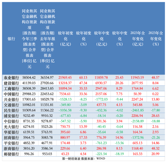 其中,农业银行、建设银行、工商银行、中国银行今年前三季度同业存款分别增长了约2.2万亿元、1.32万亿元、1万亿元、7534.61亿元,较年初增幅分别达到60%、47%、36%、34%,较去年全年明显提速。