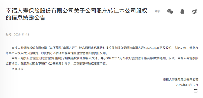 11月12日,幸福人寿发布公告称,公司股东深圳市亿辉特科技发展有限公司(下称“亿辉特”)所持幸福人寿46599.3336万股股份、占比4.6%,经北京市第四中级人民法院裁定,以抵债方式转让给存款保险基金管理有限责任公司。