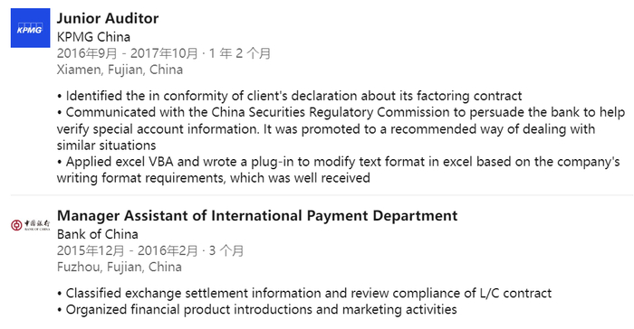 而linkedin上Ye Guangmei的账号已经变成纪念账号,根据linkedin显示,她2012年-16年在西南财经大学就读,在福州中国银行实习了3个月,然后毕业后在厦门KPMG工作了1年多,之后去加拿大蒙特利尔商学院读硕士。20年毕业之后直接进入了摩根数据科学和商业分析部门工作。是一名数据分析专家【data analysis expert 】