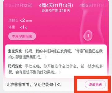11月13日,记者下载了几个被多次提及的APP,发现其操作、信息界面主要针对孕妈妈,有的软件只有孕妈妈模式,有的则需要邀请准爸爸加入。