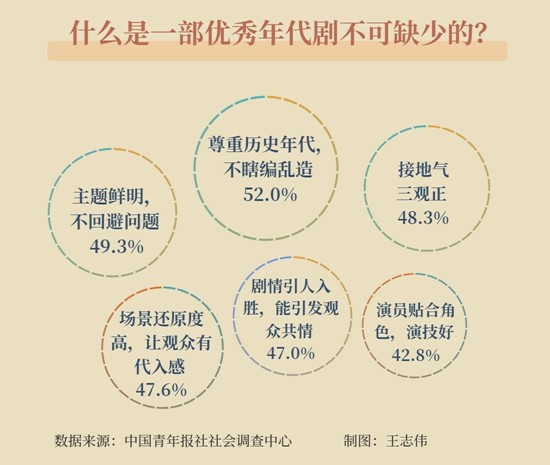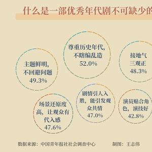 什么是一部优秀年代剧不可缺少的?调查显示,52.0%的受访青年认为是尊重历史年代,不瞎编乱造。还有49.3%的受访青年认为是主题鲜明,不回避问题,48.3%的受访青年觉得要接地气,“三观”正。