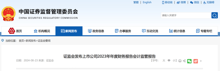 证监会发布上市公司2023年年度财务报告会计监管报告