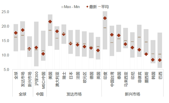 图表2:各国家和地区MSCI指数估值水平, 前向PE