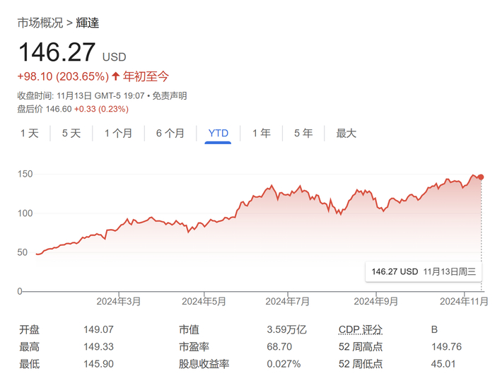 周三,英伟达股价下跌1.36%,报146.27美元。今年以来,该股已经上涨了逾200%。上周五,英伟达股价创下149.77美元的历史新高。