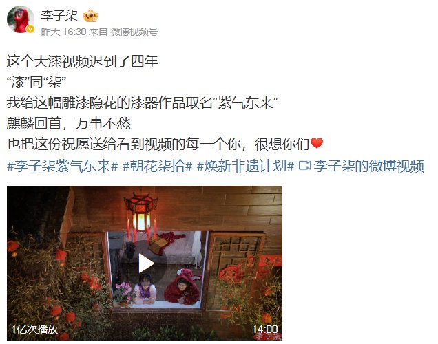 11月12日,李子柒更新:这个大漆视频迟到了四年,“漆”同“柒”,我给这幅雕漆隐花的漆器作品取名“紫气东来”,麒麟回首,万事不愁,也把这份祝愿送给看到视频的每一个你,很想你们。