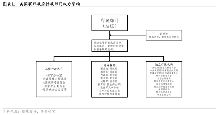 美国联邦政府基于“三权分立”的原则,由三大分支构成:行政、立法和司法。其中行政部门由总统领导,具体而言又可以被划分为总统行政办公室、联邦政府内阁各部以及独立行政机构三个组成部分。在诸多内阁负责人中,国务卿、财政部长、国防部长和司法部长通常被视为四位最重要的内阁官员,这是由他们各自部门的规模和重要性所决定的。近年来,总统行政办公室的重要性愈发上升。其中,白宫办公厅、国家安全委员会以及贸易代表办公室等岗位的人选需要我们重点留意。