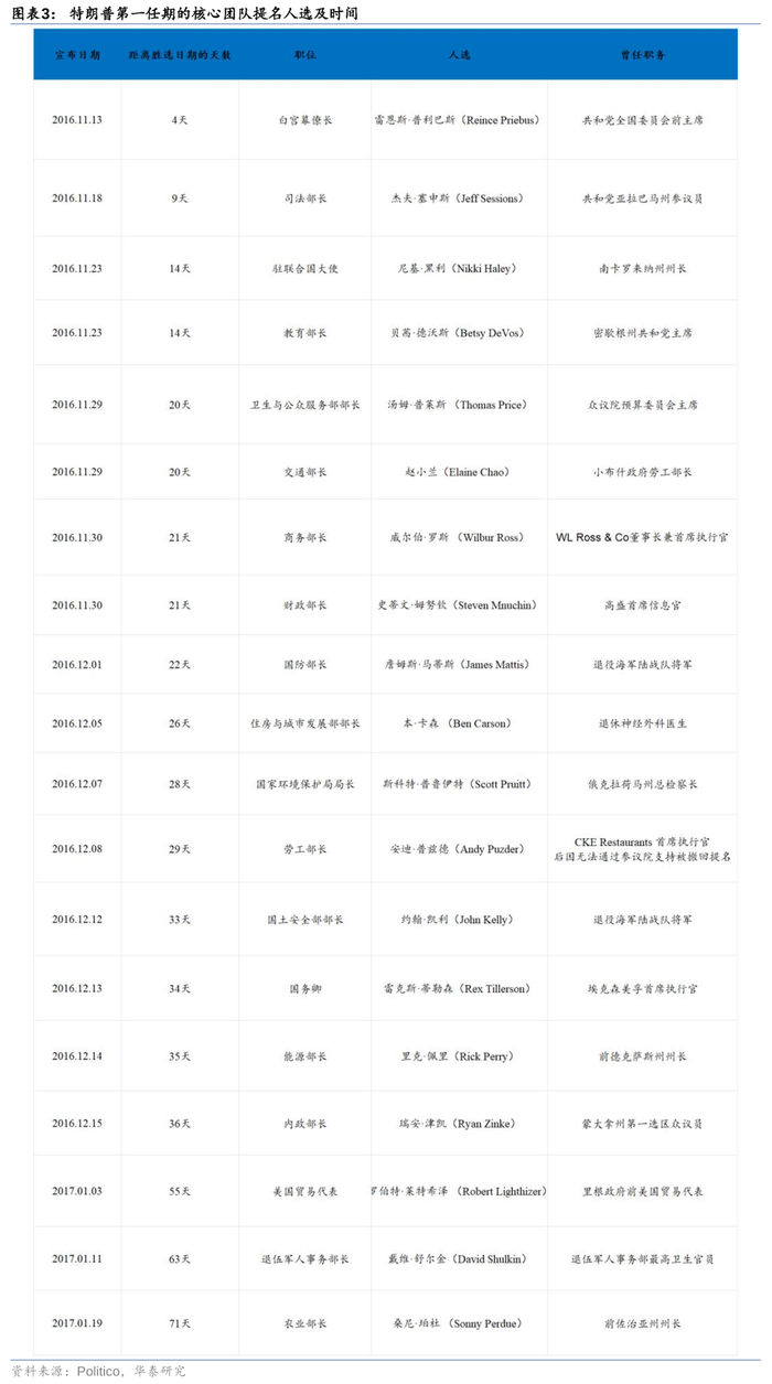 在2024年大选期间,特朗普的关联组织和智库就已经建立了一份庞大的人员名单,特朗普第二任期的执政团队搭建或会非常迅速,能否忠实执行特朗普的内政和外交政策也是其人员选拔的重要标准。对于特朗普就职之后政策推进的节奏与速度,我们应有所预期。