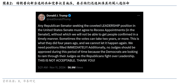 根据美国宪法,参议院掌握人事权,包括国务卿、财政部长等内阁岗位的人选任命都需要参议院的背书。在11月11日的凌晨,特朗普发文表示,希望参议院能够快速通过其内阁人选的任命。比之于第一任期的准备不足、缺乏合适的人手储备以及与民主党的博弈,特朗普第二任务的执政团队的搭建或将迅速推进。