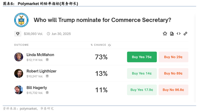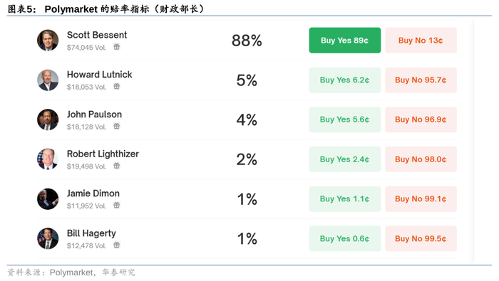截止北京时间11月13日10时,白宫幕僚长、环保署署长、国土安全部长以及国务卿和国家安全顾问、国防部长等职务已经基本确定。剩余的悬念集中在财政部长、商务部长等经贸条线的官员的任命。我们不妨以博彩网站Polymarket的赔率指标作为一个观察的窗口。