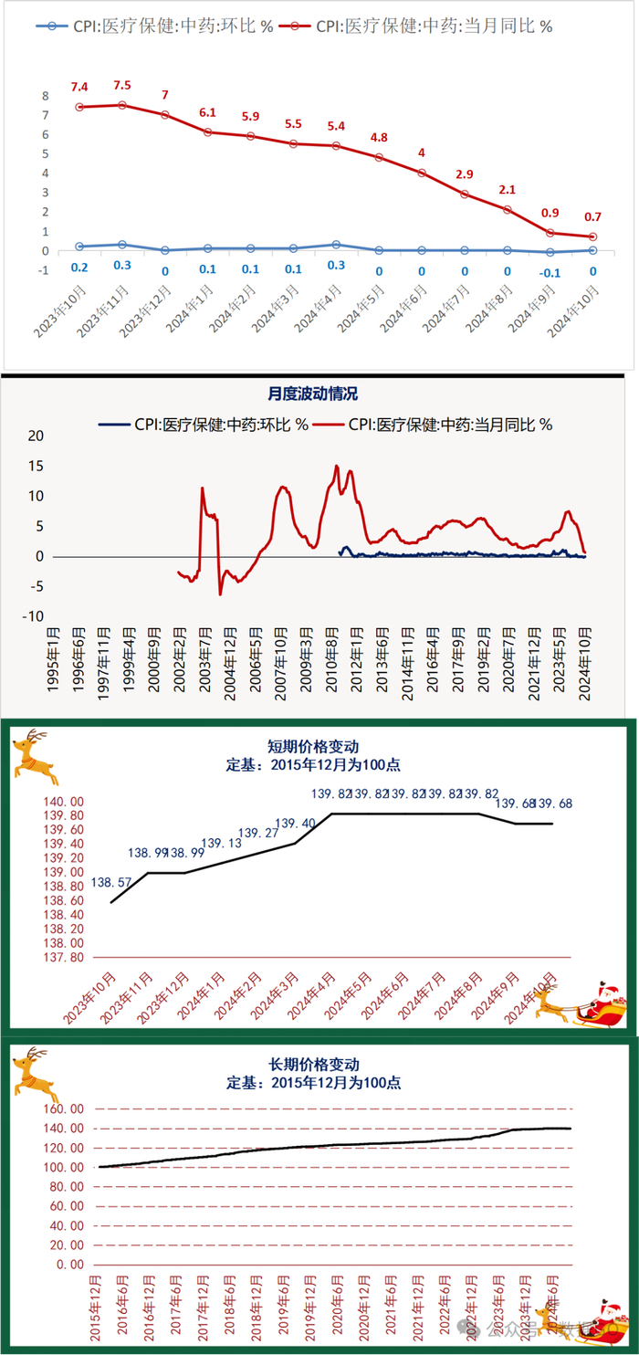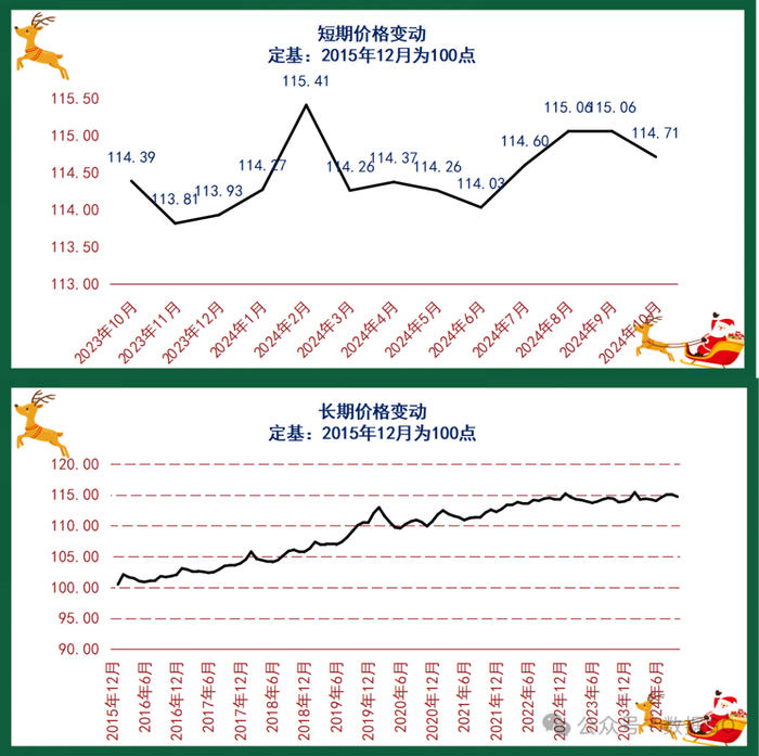 根据测算,2023年整体平均价格指数是114.23点左右,目前2024年前10月整体价格是114.60点左右,据此测算,前10月CPI跟2023年整体相比涨幅为0.33% 。如果按每年2%的涨幅为理想通胀水平,2024年测算出来的合理均价价格在116.51点,因此目前价格属于偏低。