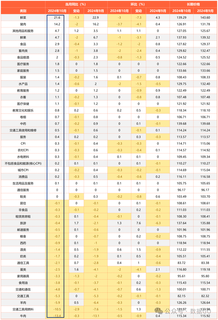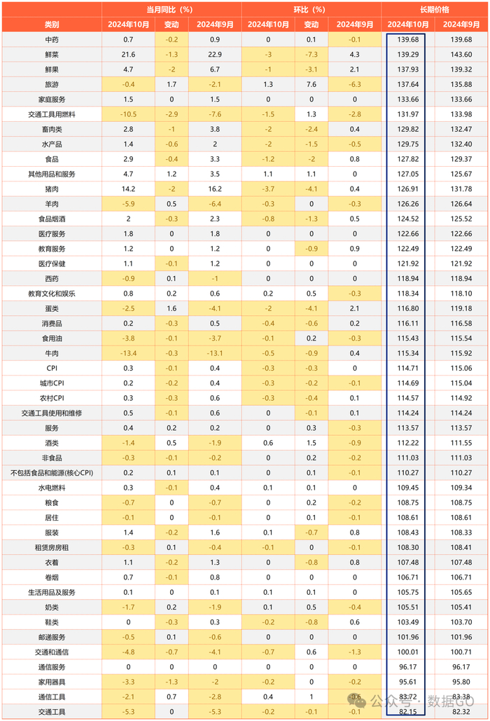 表:10月CPI明细(按长期价格点位排序)