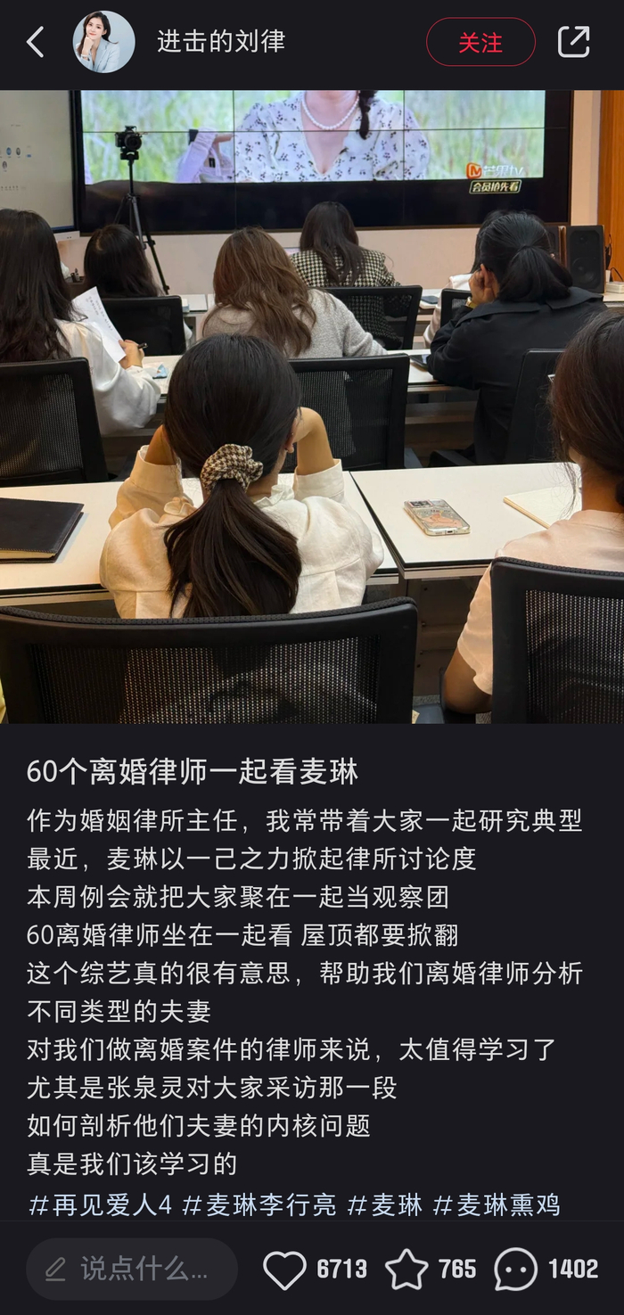 婚姻律师刘琬琳告诉潇湘晨报记者,麦琳在节目中的表现像很多来咨询的客户的样子,更能代表普通人的婚姻生活,所以就组织律所同事一起通过综艺来探究麦琳在综艺上的行为背后的深层原因,下周例会继续看《再见爱人》,网友纷纷求律所开直播让律师来当观察员。