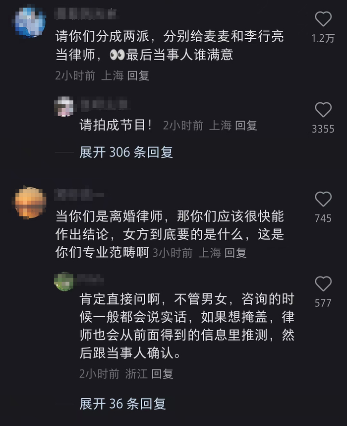 在评论区也有网友建议律师分成两派,分别站在麦琳和李行亮的角度进行分析。