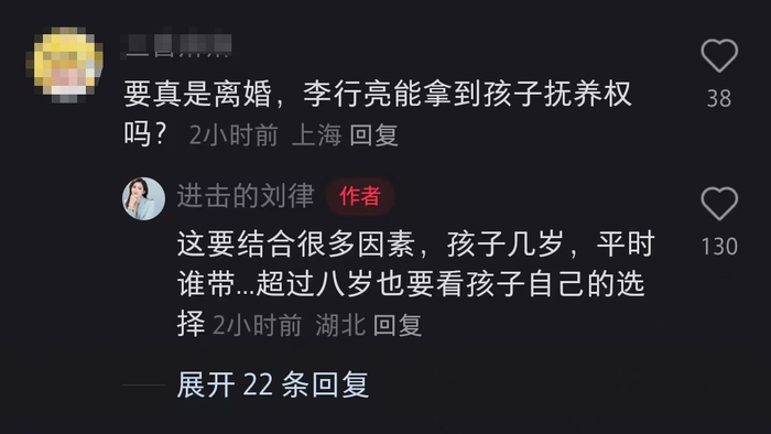 同时也有人提问,如果麦琳和李行亮离婚,谁能拿到孩子抚养权?对此刘律师回应称要结合很多因素,如果超过八岁了也要看孩子的选择。
