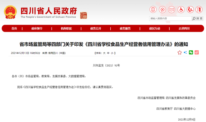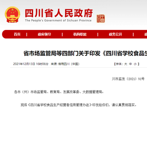 2021年底,四川省市场监管局等四部门印发《四川省学校食品生产经营者信用管理办法》(以下简称《管理办法》),推动学校食品生产经营者食品安全信用联合监管。四川省各市州开始探索建立学校食品生产经营者信用管理工作机制。