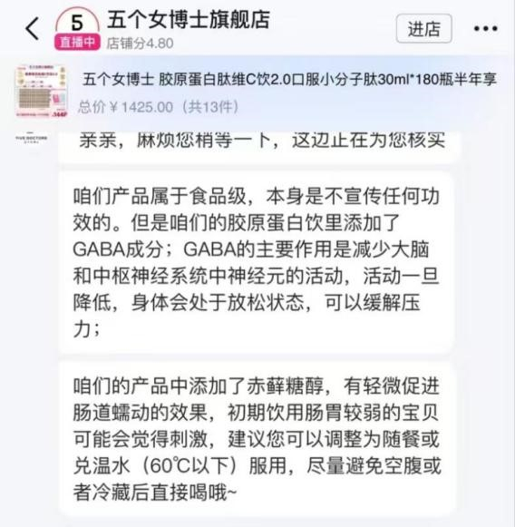 消费日报网讯(记者 卢岳□王鑫坤)“一天只需喝一瓶,三个月看不到效果可退货退款!”近日,在某电商平台“五个女博士旗舰店”的直播中,主播正在向消费者强调“补充胶原蛋白”对抗老抗衰的重要性。