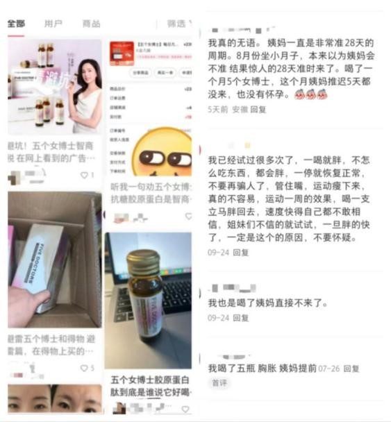记者搜索发现,在小红书、黑猫投诉等平台,多位消费者发帖称,自己在服用“五个女博士”胶原蛋白肽产品后,出现了短期内体重大幅增长、月经失调、胸部胀痛等不良反应的,而相关“副作用”在购买过程中,并未被告知。