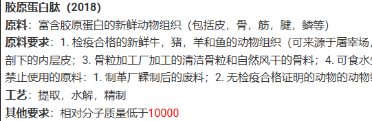 值得注意的是,因胶原蛋白肽的特殊性,中国国家卫生健康委员会和国家市场监督管理总局已于2018年联合发布了《食品安全国家标准 胶原蛋白肽》,以确保确保胶原蛋白肽产品的食品安全性与质量控制。