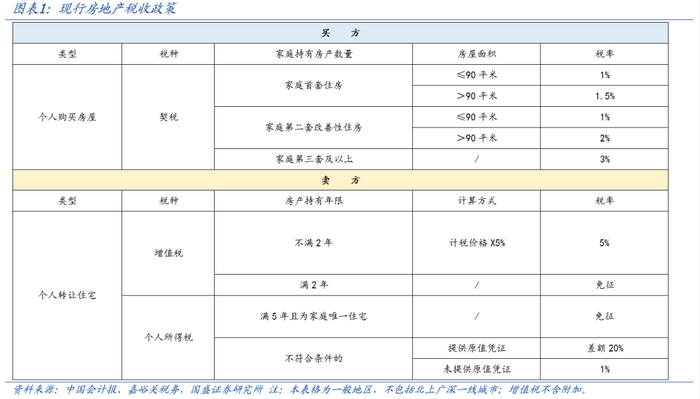 2、当前看,个人在房地产交易过程中,买方主要涉及契税、印花税,卖方主要涉及增值税及附加、个人所得税、土地增值税、印花税等,相关税率主要与房屋套数、购房时间、住宅性质等挂钩。(后附详细表格)