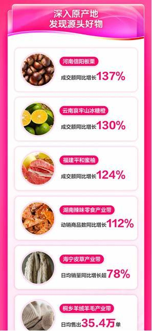 数据显示,辣条、豆干等湖南辣味零食成交额同比增长60%,动销商品数同比增长112%。秋冬来临,各类保暖服饰进入销售旺季,海宁皮草产业带日均销量增长超78%,日均卖出皮草商品超1.7万件;桐乡羊绒羊毛产业带日均销量较去年同比增长超40%,日均卖出相关商品超35.4万单,累计打造超100款销量破万单的应季产品。