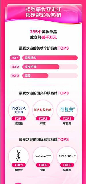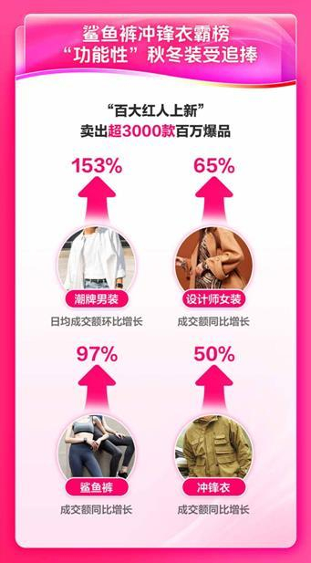 数据显示,365个美妆单品成交额破千万元,眼部精华、头皮护理和眼膜成最受欢迎的美妆个护产品。同时,品牌服饰也在双11期间销量暴增,共有116个女装品牌销售额增长100%,68个女装品牌销售额增长200%。各类鲨鱼裤深受女性消费者喜爱,成交额同比增长97%;冲锋衣领跑户外赛道,590余款单品成交额破百万元;潮男们热衷于通过抖音添置新衣,潮牌男装日均成交额环比增长153%。