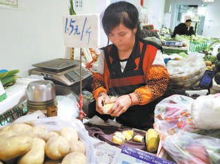 在龙潭早市二层的蔬菜大厅,记者在一家摊位前拿起两根玉米,怀着忐忑的心情问店主能否给切成段,没想到店主二话不说就答应了。只见她拿起一旁切南瓜的大砍刀,麻利地擦拭干净,把玉米切成了几截,放进干净的袋子中递给了记者,没有收取任何额外的费用。