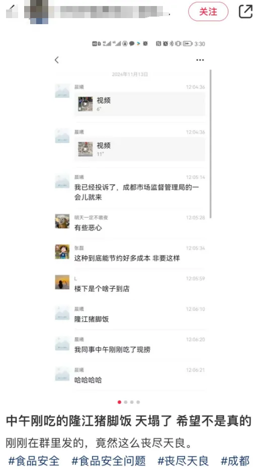 11月13日,有网友发布视频称成都一餐馆疑似回收“潲水油”,视频显示,一穿红衣服的女子从垃圾桶里舀出废油,随后端着一锅红彤彤的油返回餐馆。有网友表示:“中午刚吃的隆江猪脚饭,天都塌了。”