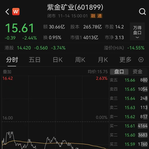 截至11月14日收盘,紫金矿业报15.61元/股,跌2.44%,市值4013亿元。