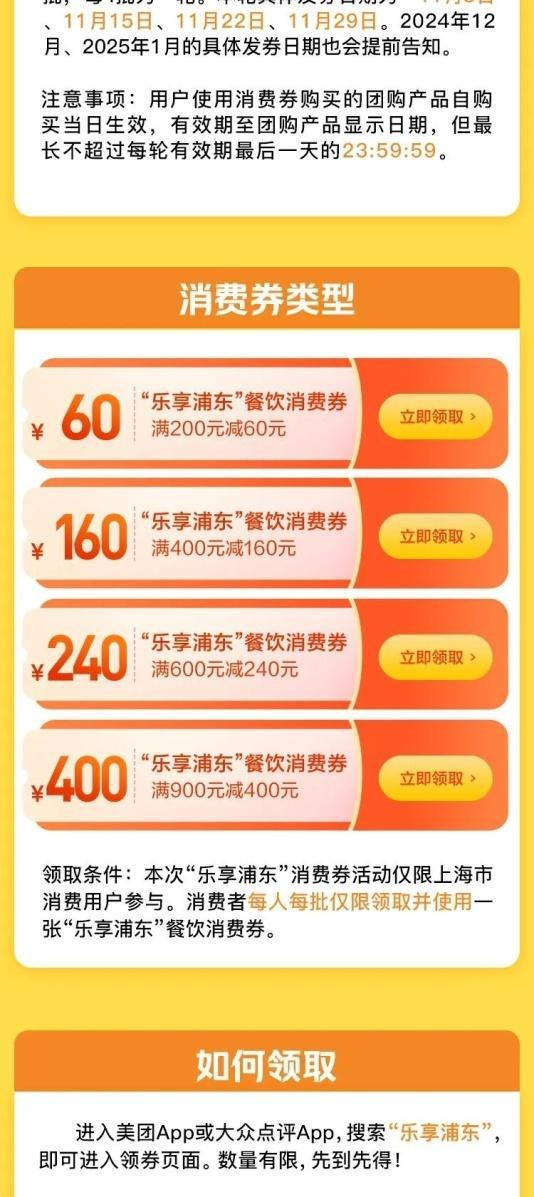 美团平台的领券方式为:消费者通过美团APP或大众点评APP首页搜索“乐享浦东”进入活动页面。(美团APP、大众点评APP为美团平台的不同发放渠道,同一用户只可在美团APP、大众点评APP择一领取。)