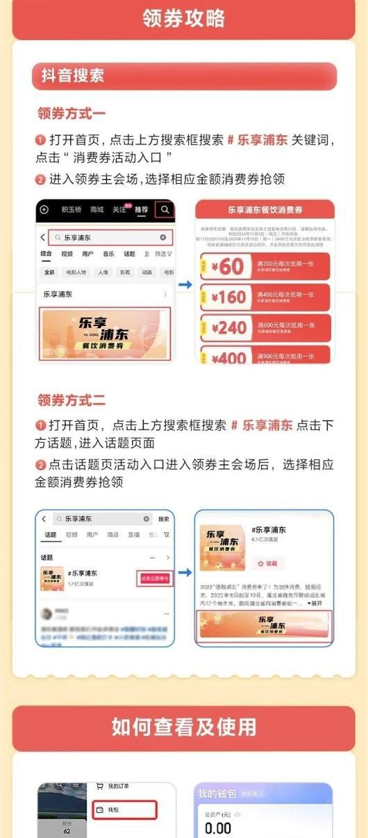 抖音平台的领券方式为:消费者通过抖音APP搜索“乐享浦东”进入活动页面。