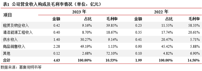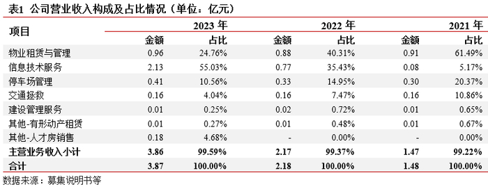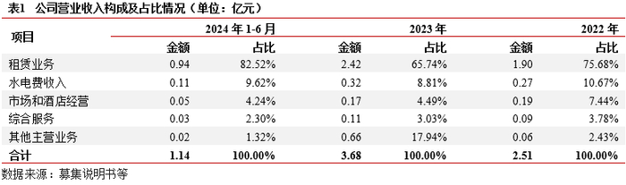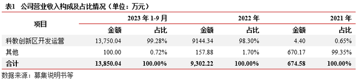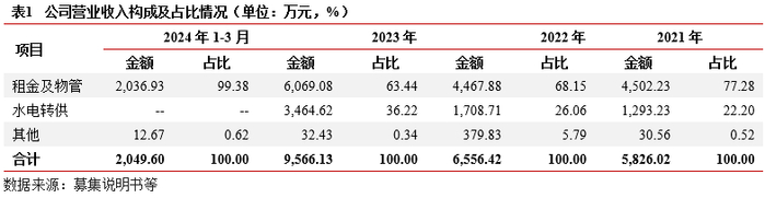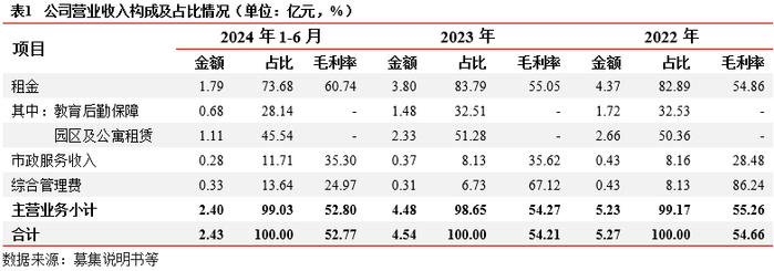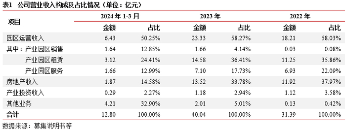 业务及收入结构:业务主要为物业租赁和物业服务相关业务。(1)物业租赁:依托区域生物医药、新能源等产业发展,公司自建自营园区物业资产,承租方为入驻园区企业。(2)物业服务:为入驻企业提供服务整体看,公司近两年业务收入集中,均为市场化业务。