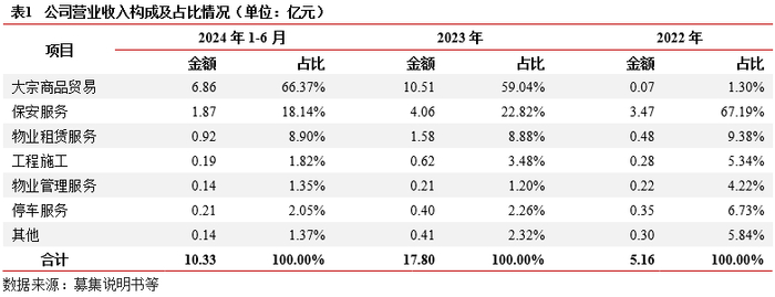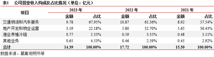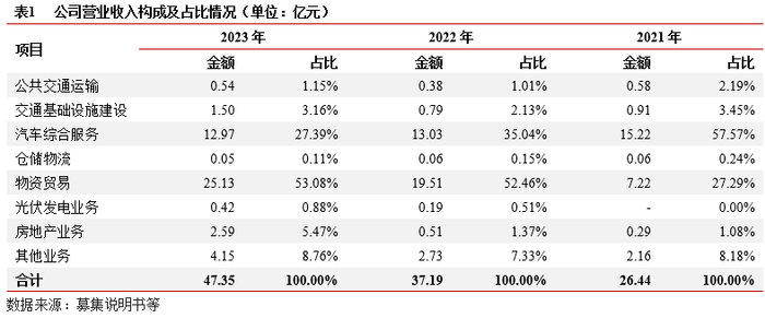 业务及收入结构:(1)汽车综合服务:包括汽车销售及维修收入,因竞争激烈,汽车销售收入逐年略有降低且处于微盈或亏损状态,汽车维修收入相对占比较低,但毛利率水平较高。(2)物资贸易:包括工程材料贸易、产品销售及商品贸易等,2022年以来收入增幅较大,占公司整体收入比重高。(3)房地产业务:主要确认自在建的润德公馆项目,该项目后续仍可确认较大规模的销售收入,公司暂无拟建房地产项目。(4)其余公共交通、交通基础设施建设、仓储物流等业务收入占比较低。整体看,公司主要收入来源是汽车综合服务、物资贸易、房地产销售等市场化经营业务,占比超过85%。