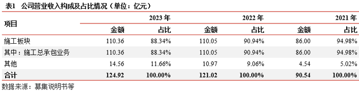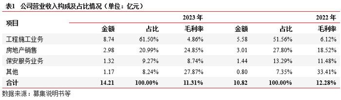 业务及收入结构:(1)工程建设及施工:资质齐全,具体包括市政公用和房屋建筑工程,EPC模式,业主方主要包括政府及相关单位、房地产开发商、制造业企业等,市场化竞争,收入波动较大,是公司目前主要的收入来源,盈利能力一般。(2)不动产销售:以政策性住房和商品房建设销售为主,目前收入规模不大,存量项目充足,未来收入有望增长,存在去化压力。市场化业务占主导,收入规模易受影响,整体盈利能力一般。