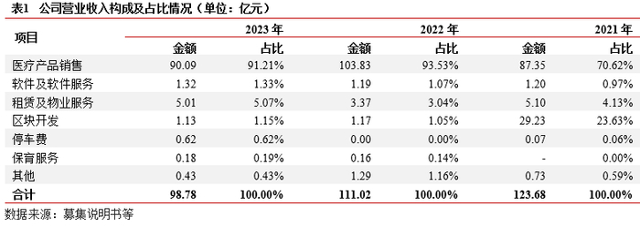 业务及收入结构:(1)医疗产品销售:2019年收购上市公司润达医疗(603108.SH)股权,成为其控股股东,产品包括体外诊断、软件开发及服务。(2)租赁及物业服务:将高新区内的资产进行市场化出租。(3)区块开发:委托代建,2022年开始收入确认改为计提管理费收入,收入规模及占比大幅下降。