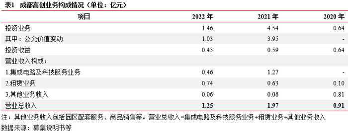 业务及收入结构:成都高创收入主要来自于直接股权投资业务和基金管理业务、集成电路及科技服务业务以及租赁业务。(1)直接股权投资业务:成都高创以自有资金对成都高新区内具有领先技术优势,高成长潜力的种子期、初创期及成长期的科技型创新创业企业实施股权投资,投资聚焦于“3+1”主导产业。(2)基金管理业务:成都高创受托管理和出资设立基金,支持成都高科技等领域产业发展。(3)集成电路及科技服务业务:成都高创负责运营智能硬件中试生态园,通过建立专业化中试服务平台推动科技成果实现产业化生产。(4)租赁业务:公司将科技金融大厦(盈创动力二期)和中日联合创新中心等自有房产对外出租。综合来看,目前成都高创营业收入规模较小,尚未实现盈利,未来随着业务发展成熟,营收和盈利水平有望提升,但需注意投资业务风险较高,未来收益实现情况存在较大不确定性。
