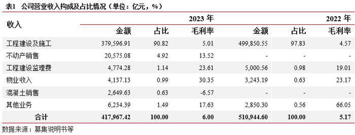 业务及收入结构:(1)施工总承包业务:公司拥有市政工程、建筑工程施工总承包特级等高等级资质,业务客户集中度低,2023年来自汉阳区的前五大客户占营收的比重为22.83%;在手订单充足且质量较好,2023年9月末在在手订单463亿元,其中武汉市内的订单金额占比约93%。(2)其他业务主要为房地产开发、工程咨询、项目管理,其中房地产项目分布在武汉市、宜昌市,以及以PPP模式参与建设和运营的汉阳区基础设施建设项目,公司据此获得项目管理费收入。整体看,公司专业资质齐全且等级较高,业务竞争力较强且区域范围较多分布在汉阳区外,以市场化的PPP模式参与汉阳区基础设施建设,业务市场化程度较高。