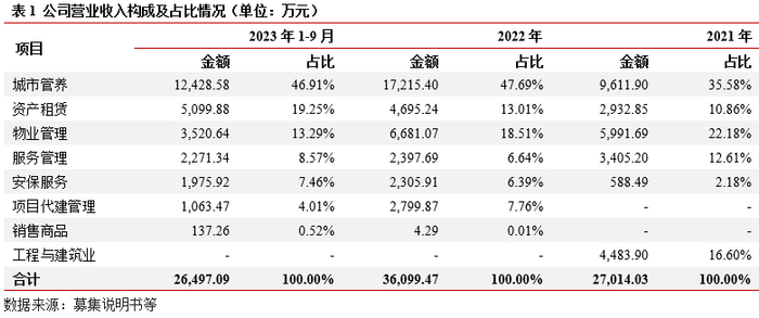 业务及收入结构:主营业务分为三大板块:城市管理、城市运营以及城市建设。其中,(1)城市管理包括城市管养、服务管理业务,其中城市管养业务,珠海联港通过参与公开招标、邀请招标等方式取得业务,下游客户主要为当地政府及行政事业单位,近年该业务规模不断扩大。(2)城市运营板块包括物业管理、资产租赁、安保服务业务,其中物业管理业务下游客户主要为金湾区及高栏港区的行政事业单位等;资产租赁业务,出租资产包括廉租房、市民服务中心等,承租方包括自然人、事业单位及公司等,均为市场化业务。(3)城市建设板块包括代建管理、工程与建筑业业务,其中代建为传统业务,收入占比很小。整体看,公司收入结构分散,其中城市管养、资产租赁、物业管理等市场化业务收入占比超过70%。