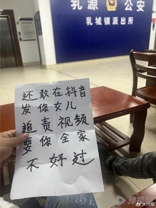 丘先生提供的图片显示,该恐吓信用黑色记号笔手写于一张 A4 纸上,纸张有折痕,内容共 20 字:" 还敢在抖音发你女儿追责视频,要你全家不好过。"