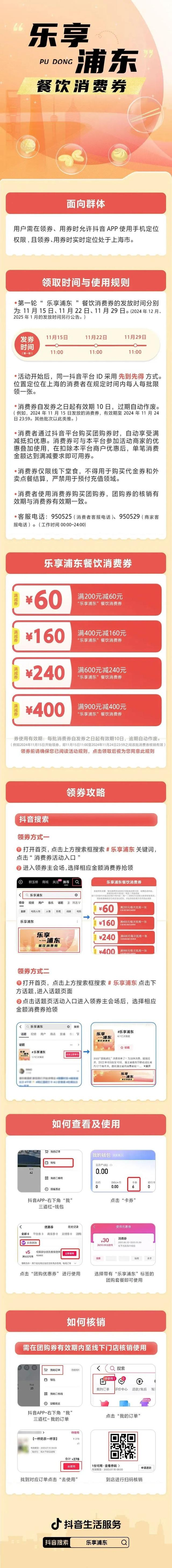 抖音APP:可在“我的订单 - 卡券红包”点击消费券查看,也可在搜索框搜索意向商户,如果商户团购券带有“乐享浦东”标签,即可下单抵扣。