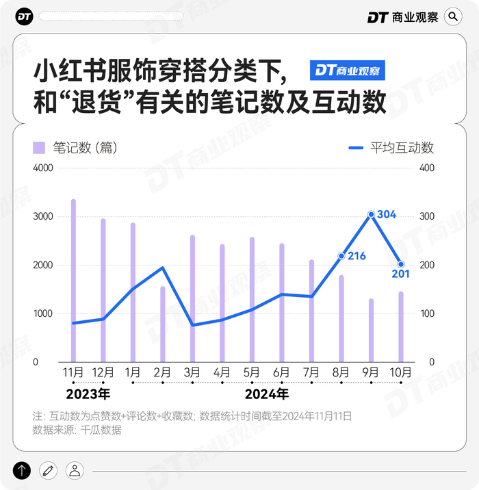 过去一年,小红书上和“退货”相关的服饰穿搭笔记数虽然在减少,但整体的互动数基本一直处于高位,平均每条笔记的互动数在今年8月、9月、10月达到了过去一年的顶峰。