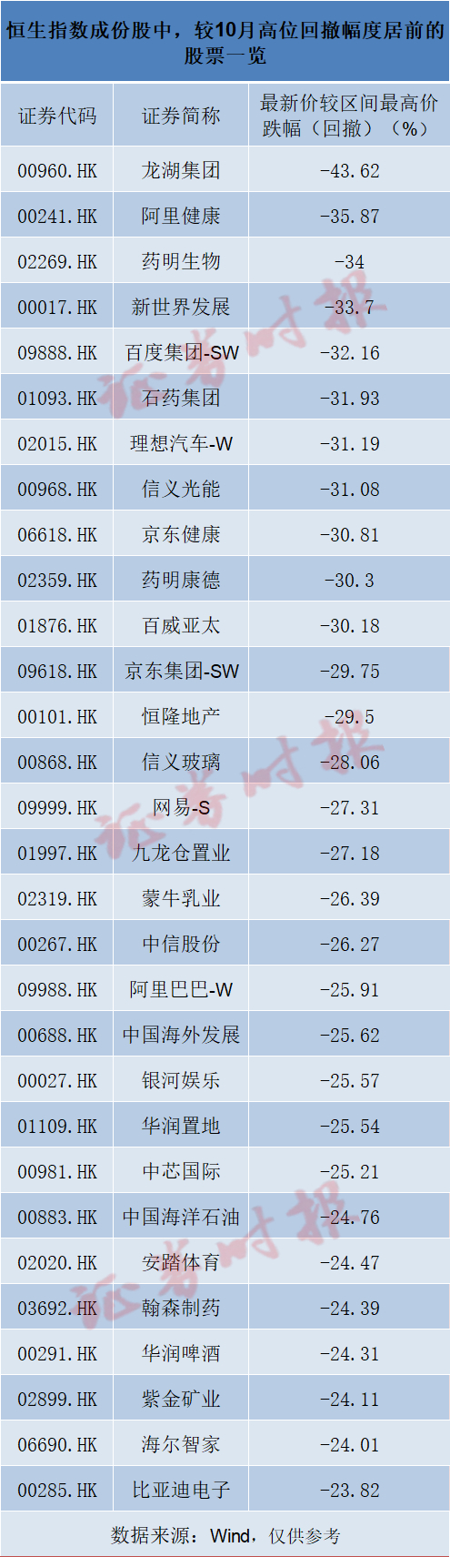 个股方面,多数港股较今年10月高位不同程度回撤。Wind数据显示,恒生指数82只成份股中,有71只股票最新价较10月高位的回撤幅度超过10%,其中46只股票回撤幅度超过20%,这里面,龙湖集团、阿里健康、药明生物、新世界发展、百度集团-SW、石药集团、理想汽车-W、信义光能、京东健康、药明康德、百威亚太较10月份高位的回撤幅度超过了30%。
