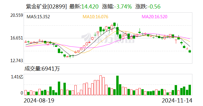 业绩方面,今年10月18日,紫金矿业发布三季报。2024年前三季度,该公司实现营业收入2303.96亿元,同比增长2.39%;实现归母净利润243.57亿元,同比增长50.68%。
