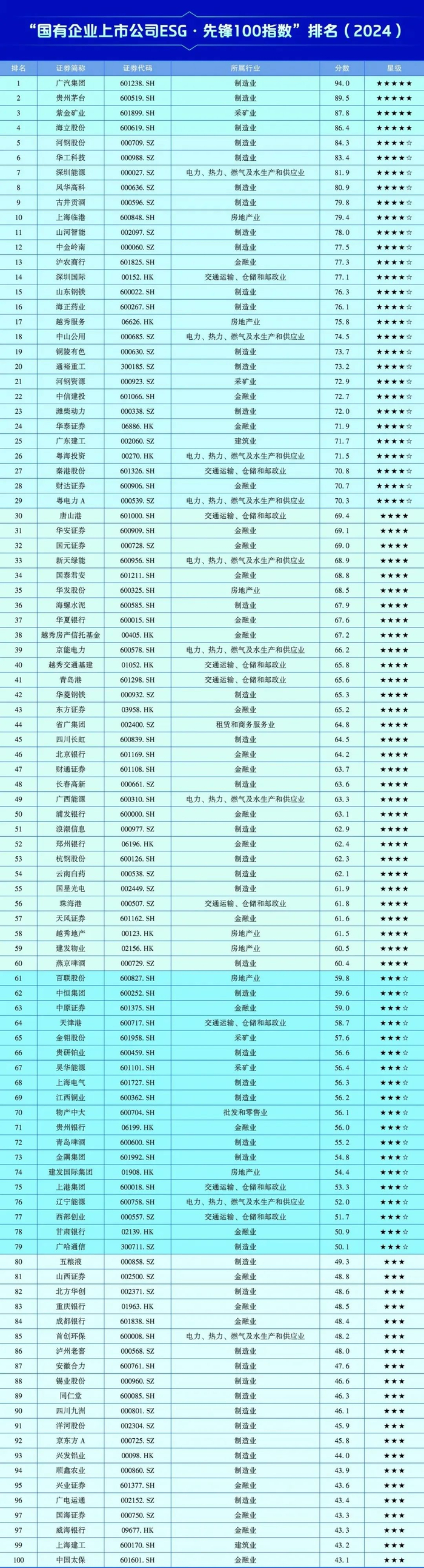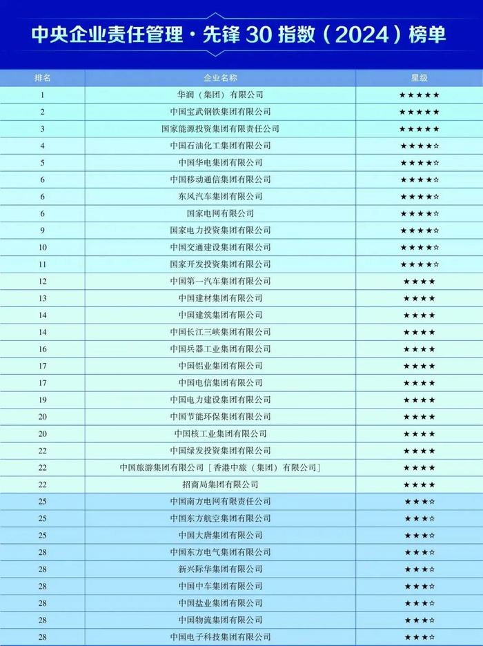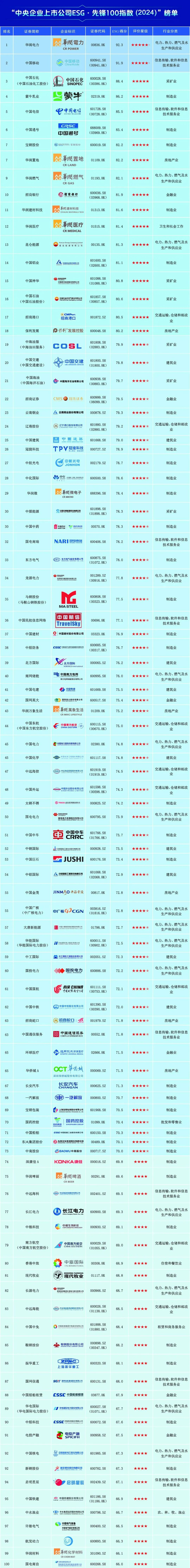 蓝皮书研究编制“中央企业上市公司ESG·先锋100指数(2024)”,华润电力、中国移动、中国石化等100家中央企业上市公司入选。