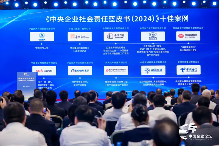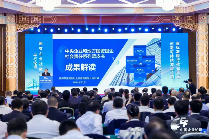11月7日,第七届中国企业论坛举办了以“高标准履行社会责任 创造可持续发展价值”为主题的国有企业社会责任论坛,正式发布了《中央企业社会责任蓝皮书(2024)》《中央企业海外环境、社会及治理(ESG)蓝皮书(2024)》《中央企业上市公司环境、社会及治理(ESG)蓝皮书(2024)》《国资国企社会责任蓝皮书(2024)》,以及“中央企业责任管理·先锋30指数(2024)”“中央企业上市公司ESG·先锋100指数(2024)”“国有企业社会责任·先锋100指数(2024)”和“国有企业上市公司ESG·先锋100指数(2024)”等多项成果。