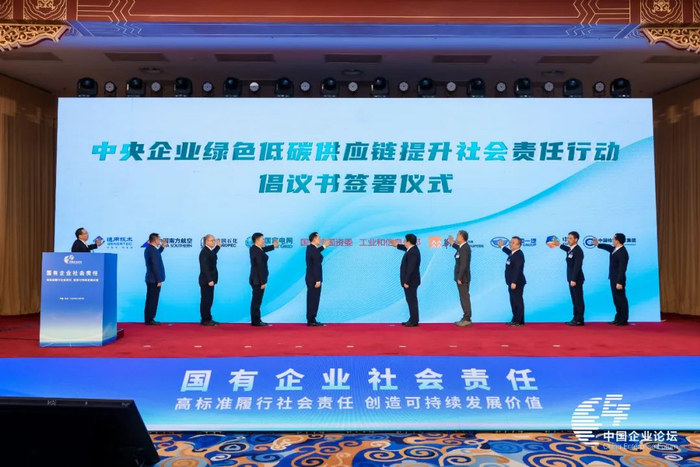 论坛现场,在国务院国资委社会责任局、工业和信息化部节能与综合利用司共同指导下,以国家电网为牵头实施单位,连同中国石化、中国一汽、南方航空、中粮集团、通用技术集团、华润集团、中国中检7家企业,共同发起绿色低碳供应链提升倡议,李军代表国务院国资委和中央企业宣读《中央企业绿色低碳供应链提升社会责任行动》发布词。