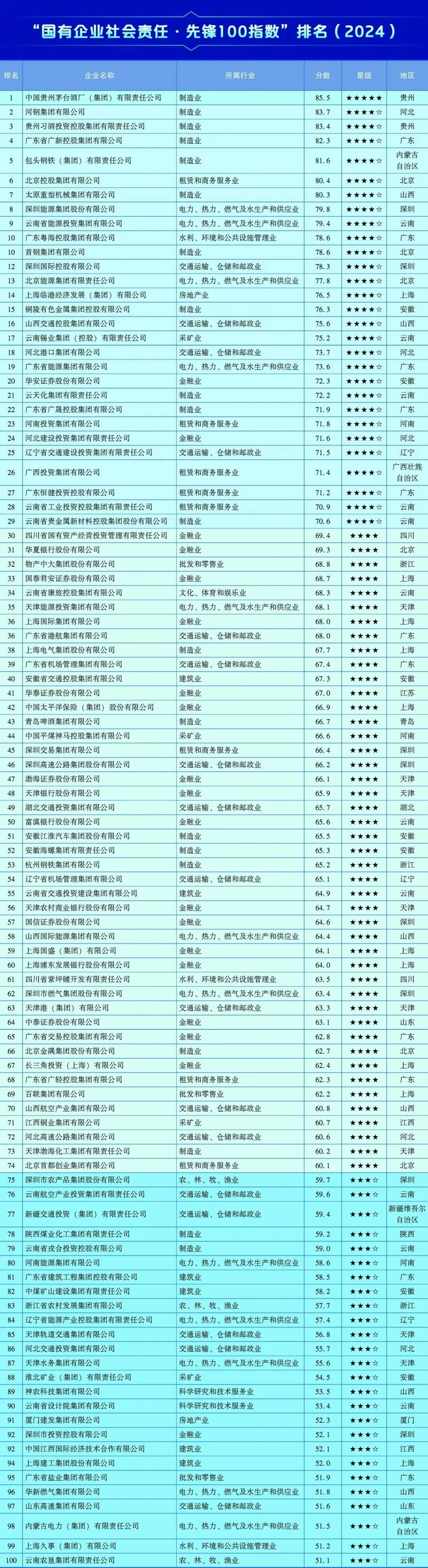 蓝皮书研究编制“国有企业社会责任·先锋100指数(2024)”和“国有企业上市公司ESG·先锋100指数(2024)”。贵州茅台、广汽集团、河钢集团、紫金矿业等国有企业入选指数。